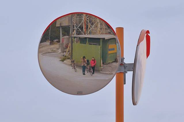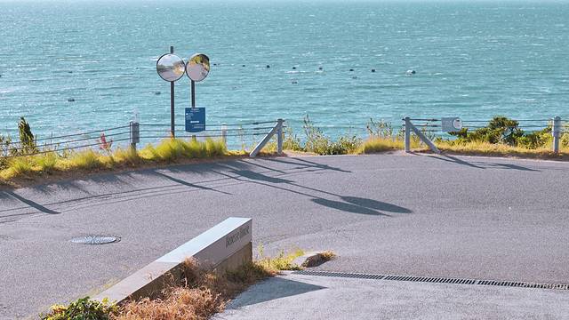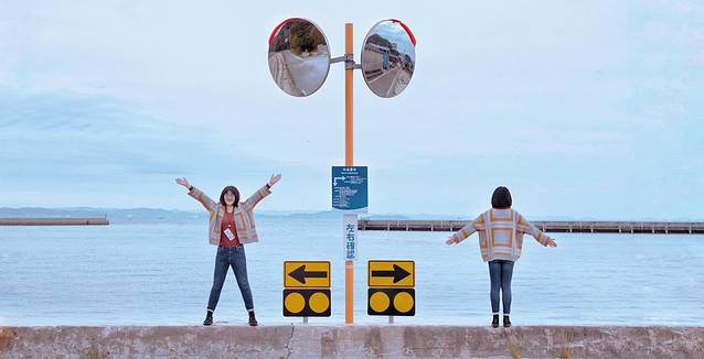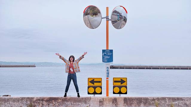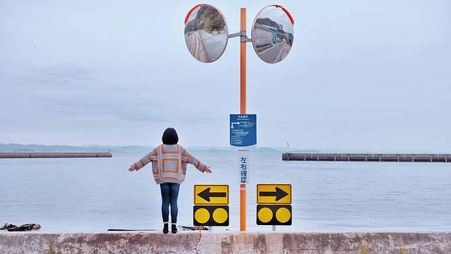 丰岛海边的双头反光镜也是很出片的地方,在各种游记里都出现过它的身影。可惜地图上并没有标注这个点。我们想了想往海边找总是没错的,说不定就“转角遇到爱”了呢!果然不负有心人。从丰岛美术馆出来一直下坡下坡往海边骑,很快这个路口就出现在我们面前了~