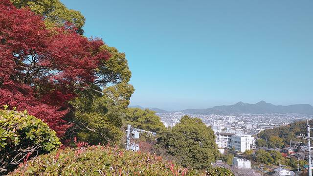 其实这前半段爬起来并不会很吃力,手里的竹竿撑一把就更省力了。走走看看很快就能到一个可以俯瞰琴平城的平台了。小意思~