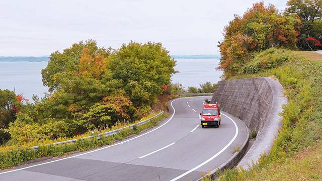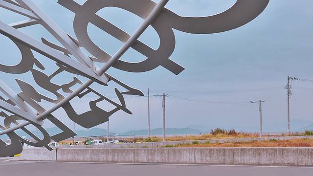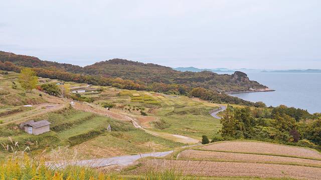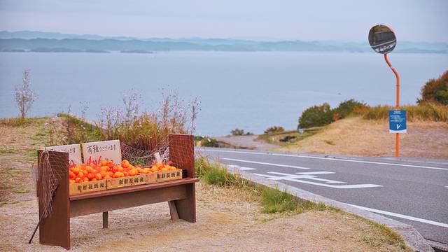这处弯道是去丰岛美术馆的必经之路,所以不用担心错过。原本这个弯道正对的应该是碧海蓝天,底下是大片田野。对了,这里的路边还有个橘子摊,没有老板,自助购买。买了一袋,就是普通橘子,但简易版自助购物的过程还挺有趣的。