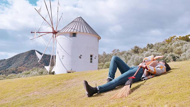 在萌萌巴士牌下车,沿着路到游客中心去领一把免费的魔女同款扫帚~先到先得~一溜小跑到大风车下,已经有不少人在各个角度“占山为王”了。为了避开人群,不得已只能在一块“秃头”的草坪上起跳了~哈哈~