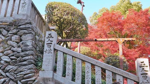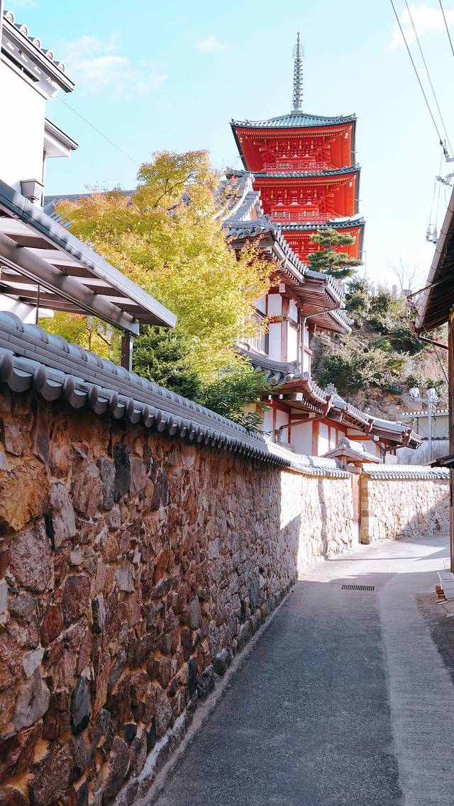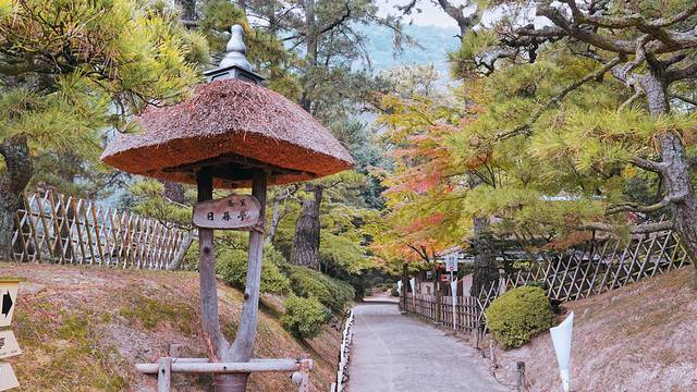 爬过商业街那段,慢慢就开始有神社那味儿了。红叶和银杏的身影慢慢出现,然后看到了挂着白灯笼的寺庙,灯笼上红字大大的写着“金”。没错啦,欢迎来到金刀比罗宫的副殿。想要见到大殿的真颜还得继续努力往上爬哟。