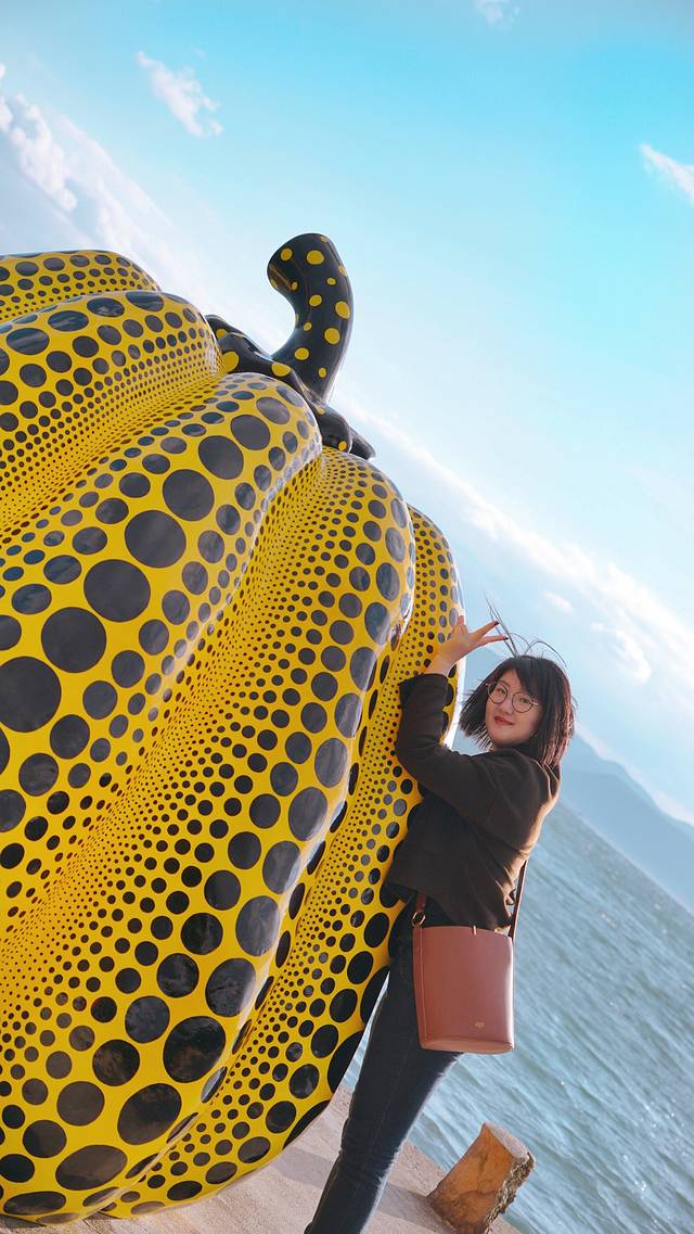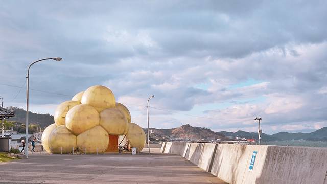 草间弥生的两只南瓜是濑户内海出圈的重量级展品。很多代表濑户内海的纪念品都是这俩南瓜的造型或图案。其中那只黄南瓜就安置在直岛海边堤坝的尽头。名曰“世界尽头的南瓜”。