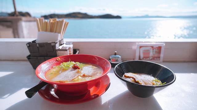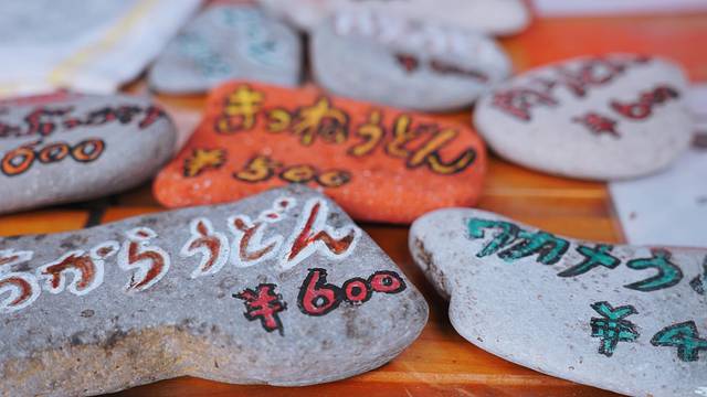 一路上继续寻寻觅觅餐厅,运气爆棚的在码头附近发现了一家租自行车的店,他们家居然还卖乌冬面。菜单都是写在小石头上的,好好玩,当然字就一个都看不懂了。按惯例挑贵的点就对了。最后喜提两碗炸豆腐乌冬面。