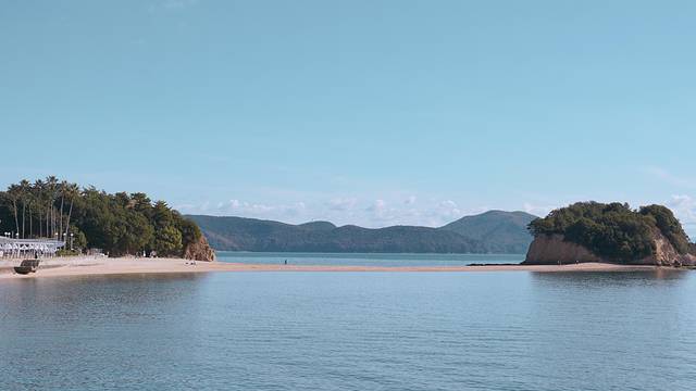 回到酒店,这里有一条私家通道可以直达“天使之路”。这个名字很好听的地方是小豆岛的朝圣之地。这条弯曲的沙洲每天随着海水的涨落潮,出现,消失,周而复始。据说在小路出现的时候,携手走玩这条路的情侣,变会遇见降临的天使,实现心愿…(霓虹金真的好二次元哦…)