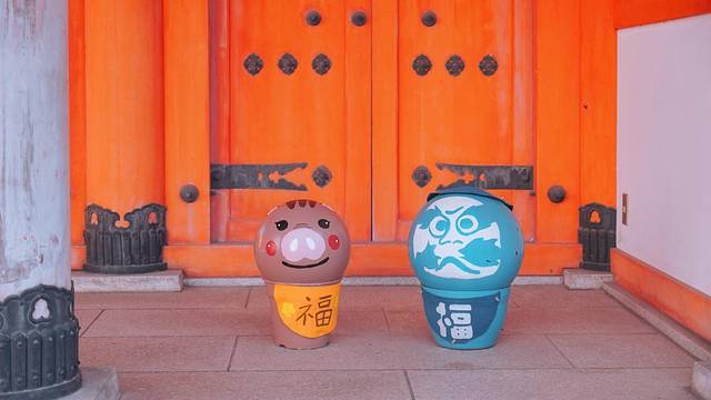 在迷路的街道上时时能在各种角度看到一座红色方塔,这里必然有一个神社啦。其实这个神社就在“迷路のまち”的路牌隔壁。门口的猪猪和长得像小叮当的达摩都挺可爱的。