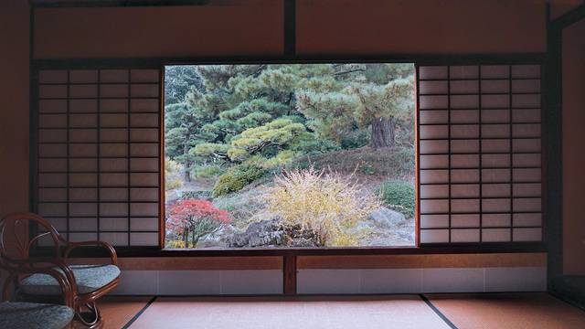 感受一下茶室的view,简直不能更棒!我觉得整个濑户内海的枫叶景观都不咋地,估计是没有大面积种植枫叶吧。矮子里拔长子呢,栗林公园还是有些红叶的,不过面积也很小,在湖中心的周边有一些。不过整体栗林公元还是主打修剪过的园林,所以满眼望出去都是大片的绿色。