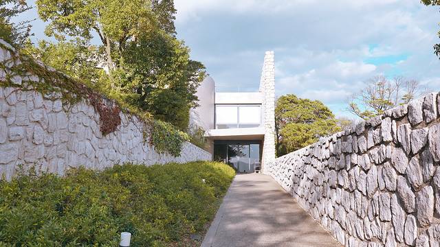 沿着海边的一直往上走就到Benesse House美术馆了。美术馆的入口也真是藏得深,走到路的尽头,一个U型调头,继续上坡就能看到入口了。入口前有一条长长的引道,检票口非常像酒店前台,别怀疑,找对地方啦!至于为什么会像前台呢,我猜是因为Benesse House同时也是一个高级度假村,这里的住客是可以在美术馆闭馆之后继续参观的,当然住宿价格不便宜,而且超抢手的。