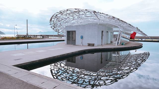 从女木岛到男木岛差不多也是20分钟船程。男木岛的观光案内所本身就是一个艺术品,名叫“男木岛之魂”。整个建筑都是白色的,不同语言的“欢迎”组成了镂空的屋顶。最绝的是,馆所建在一个池塘上,这个海天一色的倒影真是绝了!好一张名片!