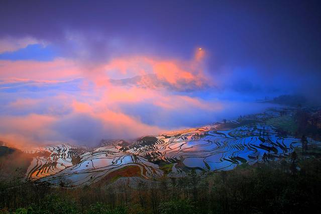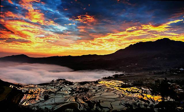 在中国,有一种美叫做梯田之美,美的自然,美的振撼,美的沉醉,美的耀眼,随着山势的起伏,错落有致的每块梯田都显示出与众不同颜色,远远望去,春如层层银带,夏如滚滚绿波,秋如叠叠尽染,冬如清清可鉴美不胜收。你看那依山而造的梯田,一层层从山脚盘绕到山顶,四季的梯田,日出日落,霞光万道,迷雾缭绕,如诗如画,恍如仙境。