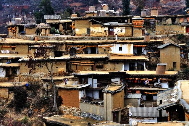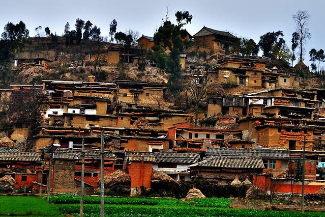 一幢幢土屋依山顺势而建,左右连贯,上下相通,下家屋顶就是上家的庭院,只要进入一户人家,就可以从天井中登木梯上平台进入另一户人家。城子村以古老的彝族土掌房民居著称,至今仍保留有“昂土司府”“李将军第”“姐妹墙”等历史遗迹,是我国西南地区规模最大的彝族土掌房建筑群,并入选第七批中国历史文化名村。村子外面是大片的田野,冬夏交替、作物更迭,美丽确实经久不变。