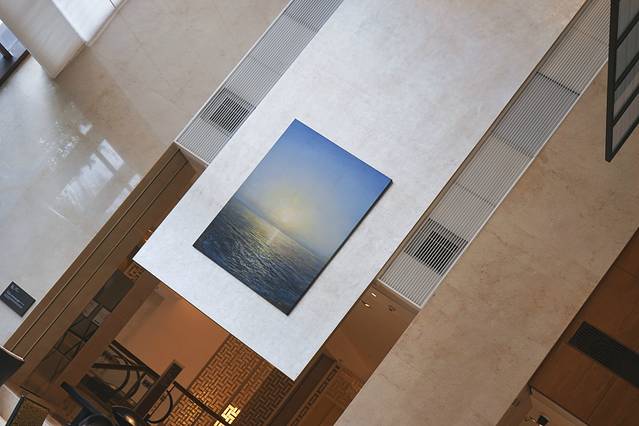 踏入酒店大堂,艺术气息立刻扑面而来:正中心是青年艺术家叶子伦的作品《798大火车》;另一面悬挂着陆亮的作品《观沧海》;电梯廊上,挂着李陈辰的两幅作品。《彼岸•冷城》与《微光•迷夜》……酒店每个角落,都能与艺术不期而遇。