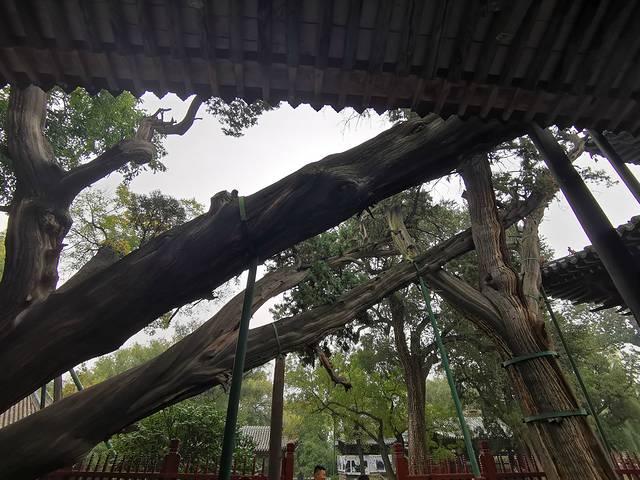 这个树是和圣母殿同岁的。而且是树木有情的证据。殿的两旁本来种有两棵树,但左边那棵树被雷劈死了,右面这棵就慢慢地开始要倒了,结果在它前面又长了一棵小树,把它支撑住了。(此处省略脑补的1000字爱情文)