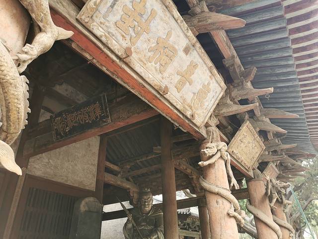 圣母殿门前每根柱子上都有雕刻得栩栩如生的木雕龙盘在上面。据介绍,这是中国现存最早的木盘龙雕刻。距今已经一千多年了。
