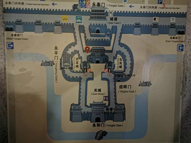 我们正好从南门上,刚好能够看到瓮城、月城、耳城、关城、箭楼等比较齐全的军事城墙。我除了觉得震憾,说不出其他感觉,直让人佩服古人的军事智慧。对于老公来说,他简直兴奋坏了,一直跟我说他圆了一个梦,让他终于明白古人的军事堡垒是怎么排布的,让他拨开迷雾见识到了真正的他心目中的城墙。虽然这里的城墙是新造的“赝品”,但是不妨碍我们欣赏它所展示的军事魅力。