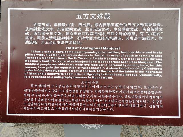 黛罗顶是不去五台(五台是南台、北台、中台、东台、西台各自为政,离得又远)的推荐点,在它一个顶上请了五个台的菩萨过来。对了,还有一个点也让人无语,官方没有提供任何解说的途径,还不如我在半山腰休息的时候听当地的摆摊的老人讲的东西精彩。那个老人说,黛罗顶没意思,都是新建筑。我一听,顿时竖起耳朵。据他说,这里是顺治帝出家修行的地方,康熙为了他爹参禅礼佛更方便,于是把五个台上的佛像都请了过来。那五个台上的建筑才是老建筑,很多都是北魏时期的建筑。当然这些都是道听途说,无从考证,因为安排的原因,那五个台我们一个都没有去,去的话只能坐景区的小巴,一次去两个台,价格还不一样。