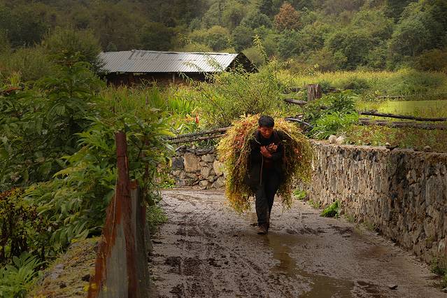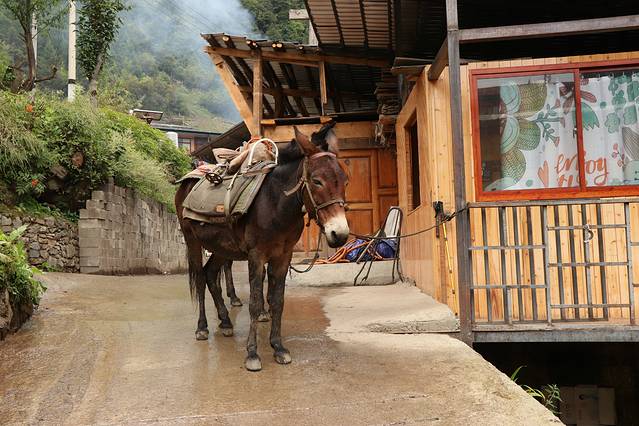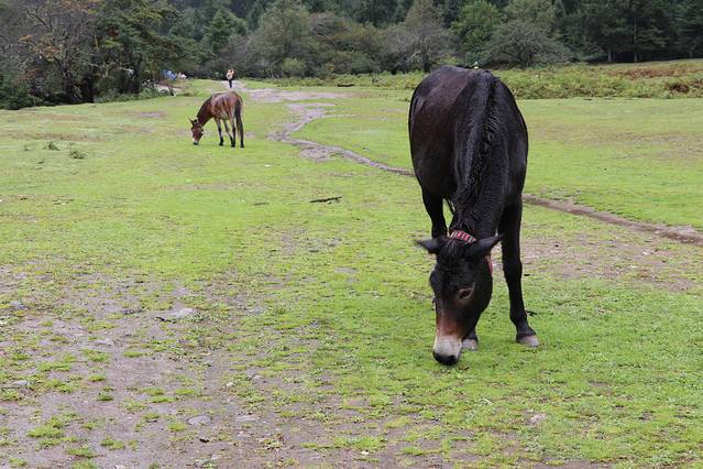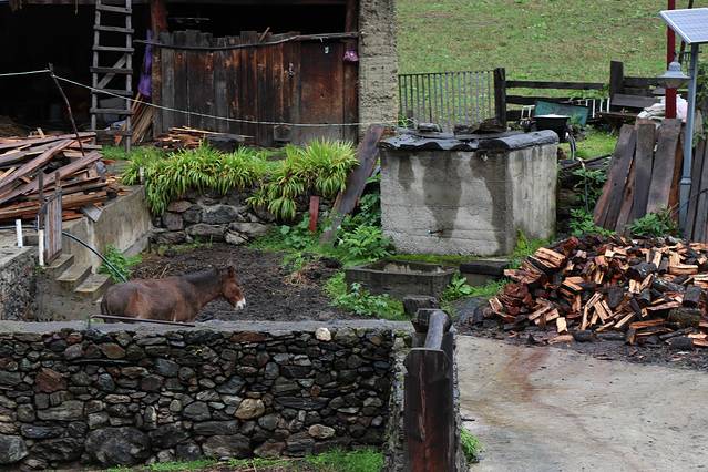 因为昨天脚磨破了没有去神瀑,天气阴冷,在下雨崩的客栈躺了一上午。相比上雨崩,这里更有乡村的感觉。从门口到后院会经过一片玉米地和鸡圈,旁边是当地村民的家,杂乱的柴火堆旁站着认家的驴,有时自己出去溜达,溜达完回来睡觉。