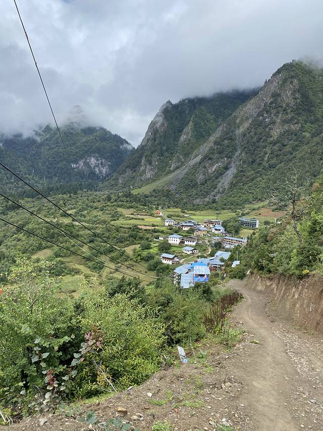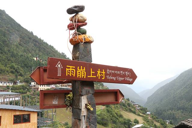 开车绕过崎岖盘山道,约1小时后到达村口,然后自己拎行李走路进村。眼前的小房子就是上雨崩,然而山路多泥泞,拎着行李重心不稳,一段下坡路还走了20分钟。