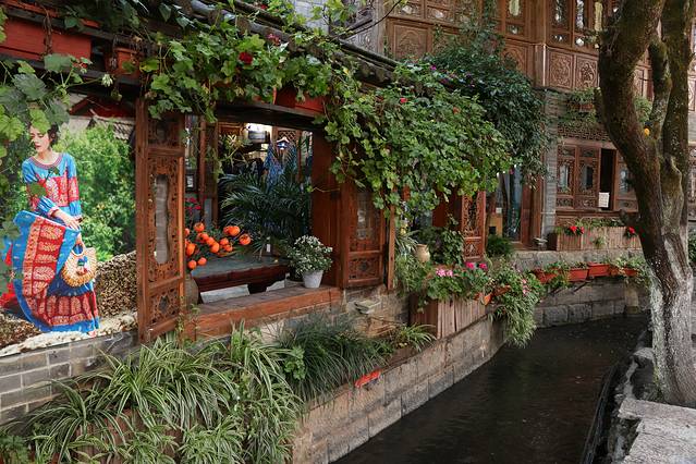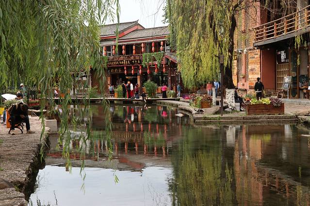 束河不大,镇中心是一面垂柳下的小湖,周围是各式餐吧、茶叶店。这里人不多,所以相比古城,在这里倒是可以面对平静的湖水安静的喝杯咖啡或红茶。