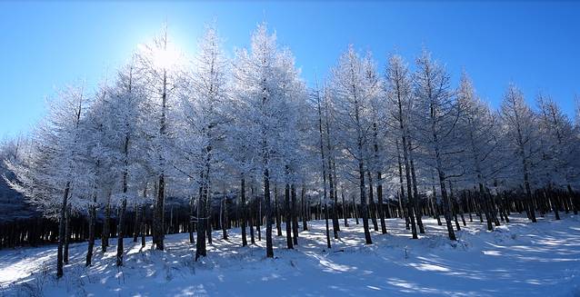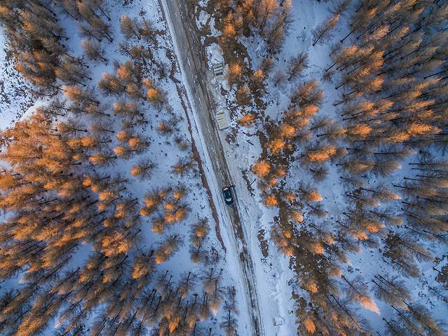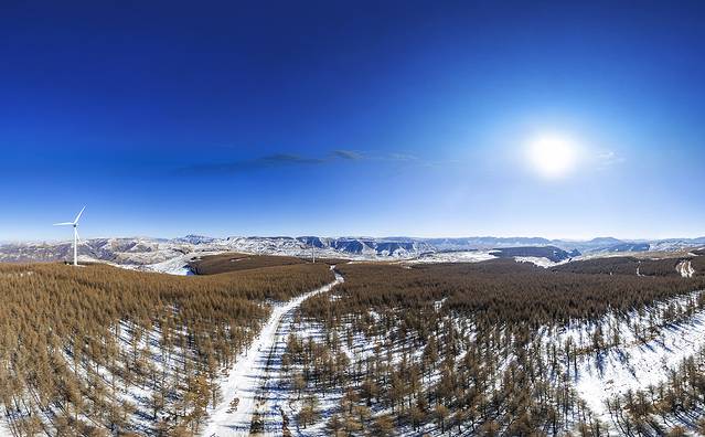 带了雪的松林以一种磅礴的姿态伫立,纯洁的白色与绚烂的橙黄融为一体,高处俯瞰,满目林海,苍莽壮丽,林海雪原呈现出小天山别样风情。