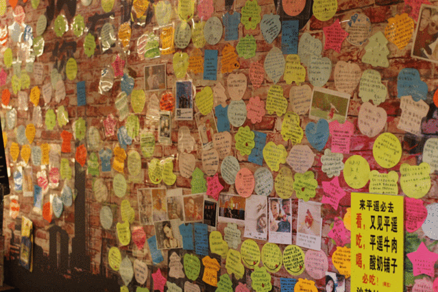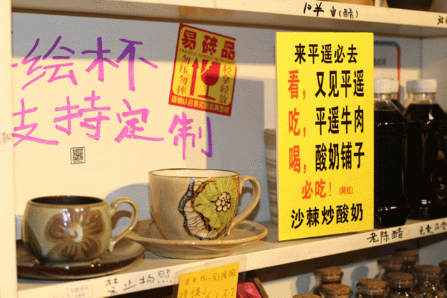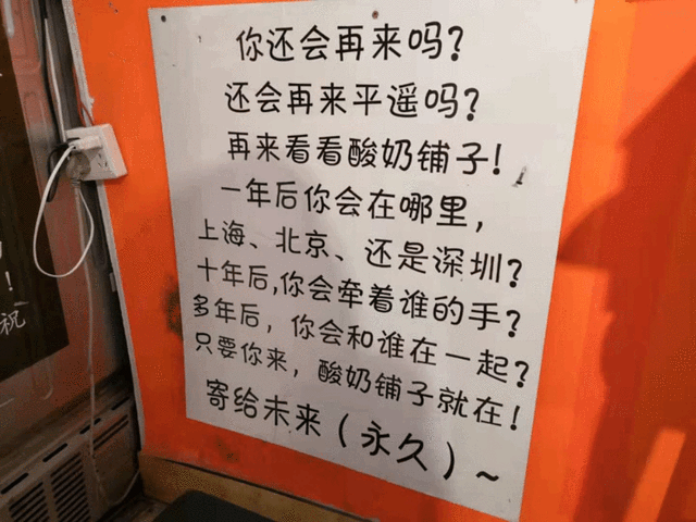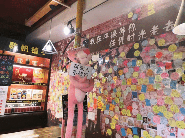 “梁先森の酸奶铺子”不像饮品店却在卖饮品,不像礼品店却在用心做文创,不像解忧杂货店却在为人解忧......或许说它就是一个独特的、年轻的店铺。它最著名的卖点就是“记忆”,你可以将对自己或对他人想说的是话写到这个小店的墙面上。或许到了哪一天,又会被谁看到,又会被谁想起。墙上的便签,是人们从全国各地来到平遥的见证。