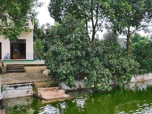 它置身在水塘边的绿树丛中,是个丘陵地带,漫山遍野被果树林环抱着。