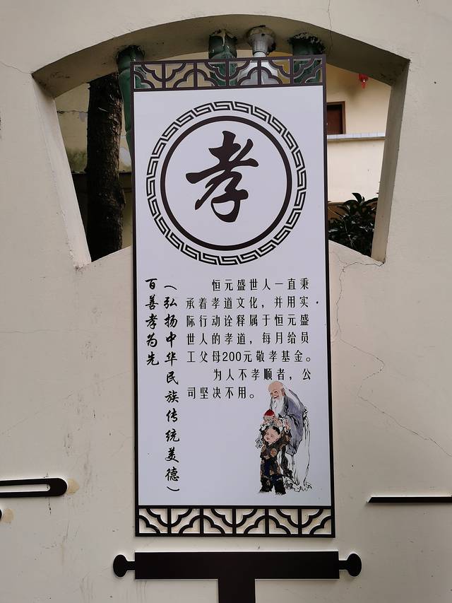 在工程管理部门前专门竖立了一块“百孝经”牌子,上面有句话“羊羔跪乳尚知孝,乌鸦反哺孝亲颜”。