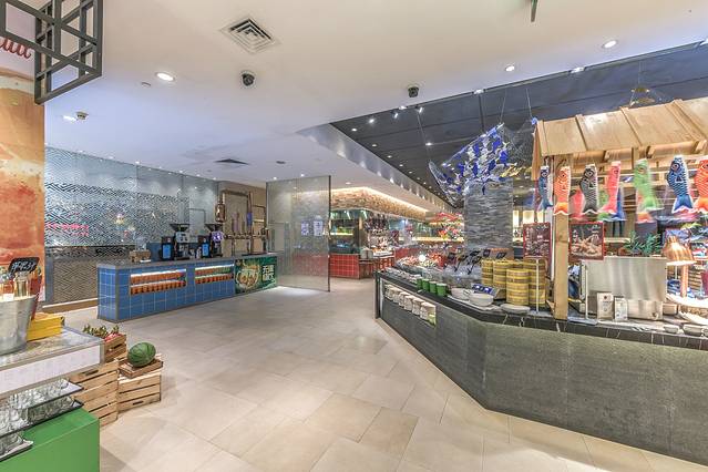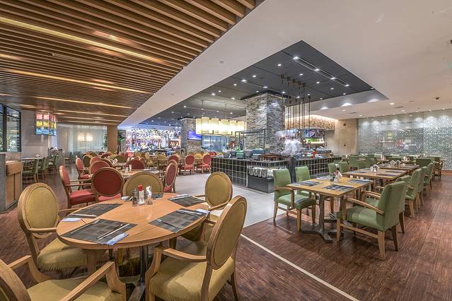 西餐厅的面积比较宽敞,有着比较舒服的空间感。虽然就餐的桌子不多,但是分布错落有致,给人非常不错的视觉体验感。很多人可能要问这种不通风且无窗户的餐厅,空气质量能够得以保证吗?可以肯定的回答完全可以。室内的换风机与空气净化器的功率相当大,为空气的流通与呼吸环境提供了非常可靠的保障。