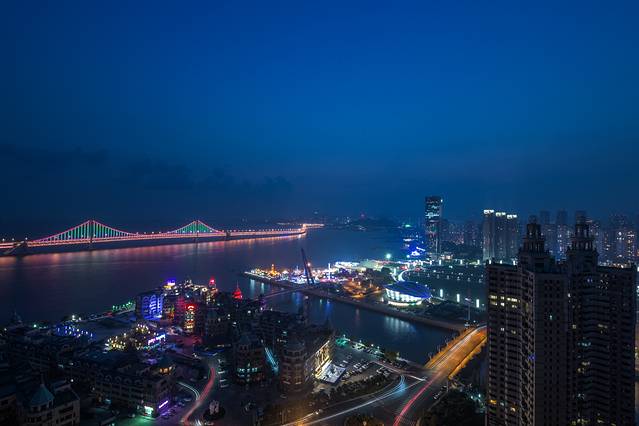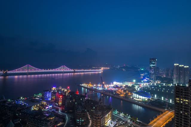 夜色中的大连美轮美奂,与国外很多发达型海港城市一样充满了都市的气息!找一个地势较高的地方欣赏大连海港夜景真的太震撼了。摩天大楼与对面的跨海大桥形成渤海西海岸最美夜景海港,这就是夜色大连的无限魅力。这是我站在下榻酒店的阳台上的视角,是不是很震撼?