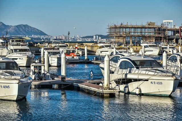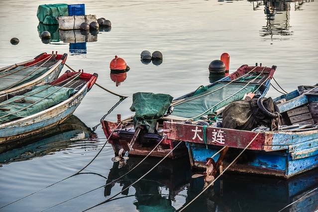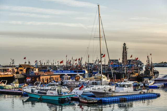 当太阳即将落山的时候,所有的船只都停泊于此。密密麻麻的船只很有意思,一个挨着一个的船只形成了大连海港最生动的市井气息,这应该才是大连渔人码头最具特色的风景线了吧?