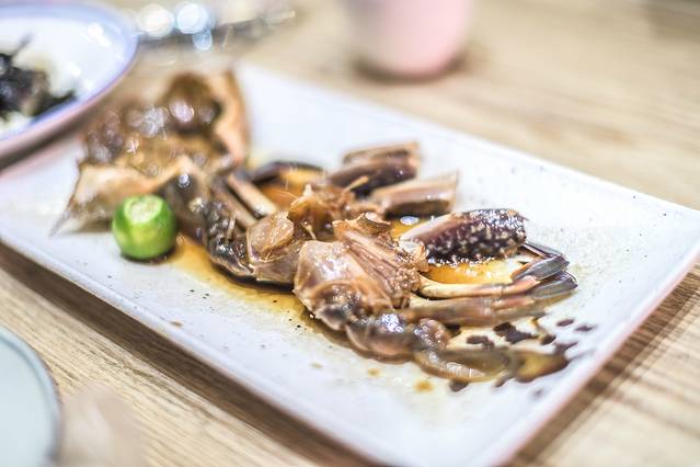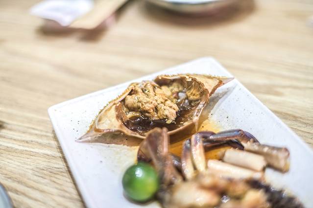 据说这家餐厅的食材非常好,都是来自大连渤海与黄海之间的深海处的,不知道真假。一贯来都喜欢求真的山野君怎能不去体验这些菜品呢?首先上菜的是来自黄海的海蟹,它是完全用酱油水浸泡的,保留了原汁原味的海蟹在酱油水的作用下非常鲜美且不失新鲜味,不错!