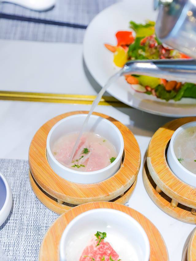 冲浪雪花和牛汤:直接用烧开的牛肉汤浇上,即可食用,汤味清淡爽口,牛肉鲜嫩。