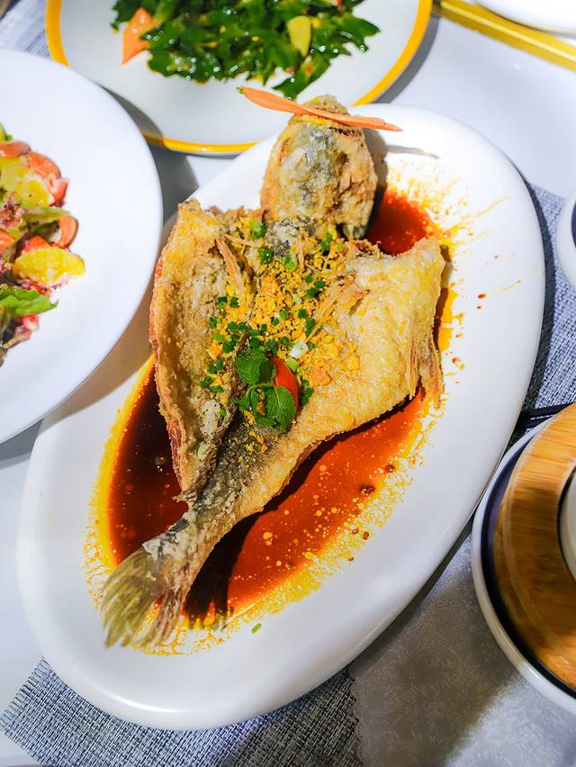 糖豉汁香蒜黄鱼:裹上淀粉后再油锅中烹制而成,口感外酥里嫩,搭配糖豉汁更加香甜美味。