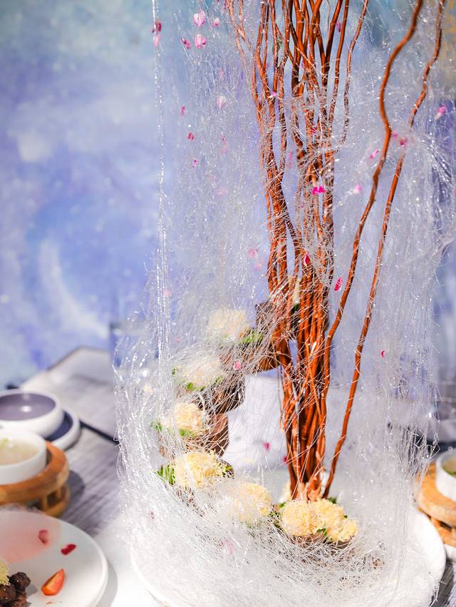 牛油果芥末虾球:创意很棒的一道菜,树枝间挂满了糖丝,芥末虾球被包裹于树于糖丝间,虾肉吃起来鲜嫩Q弹,搭配着微辣的芥末,味道很棒。