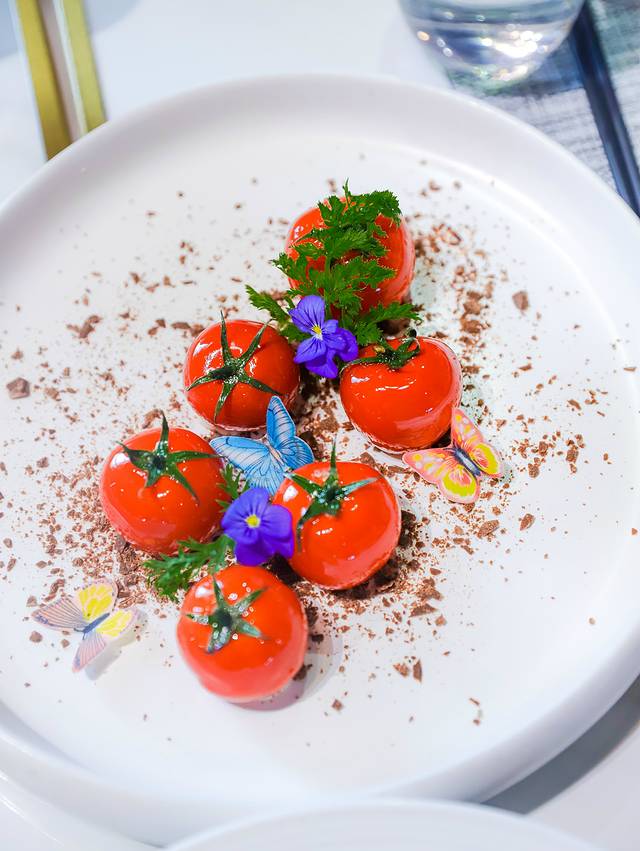 番茄脆果沙拉:颜值超高的一道菜,小番茄底部开口,在中间放了坚果和沙拉酱,酸甜口感,极力推荐。