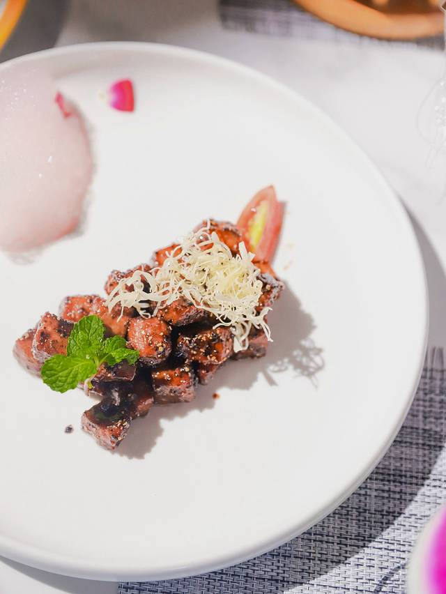 红酒泡沫牛肉粒:牛肉品质很棒,入口鲜嫩多汁,又有嚼劲,香甜的红酒味中,夹着一丝黑胡椒味。