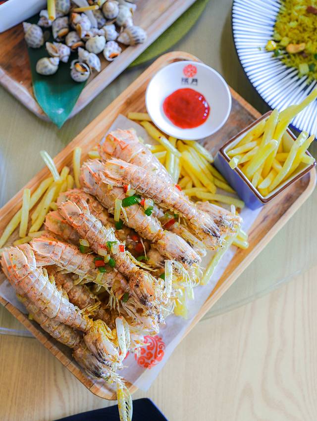 吮指椒盐皮皮虾:中西合璧的一道海鲜,除了皮皮虾,还配有薯条和番茄酱,一口鲜美的皮皮虾,一口薯条,吃的很过瘾。