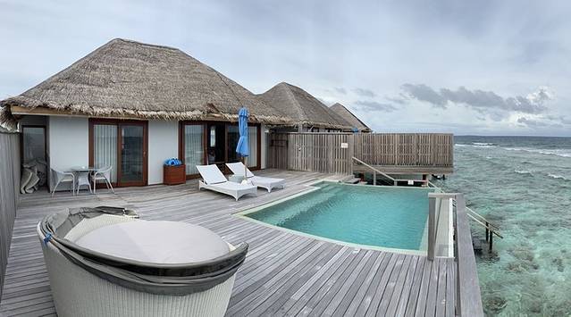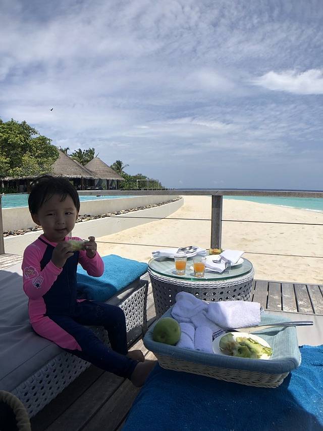 都说选岛是最麻烦的,但是我们很幸运。选了 都喜天阙岛 ,事实证明这个岛非常符合我们的需求,体验一级棒。沙滩A级,浮潜A级,属于六星岛。八天七晚,三豪沙+三豪水+1 马累 ,两大,两小价位大概在四万多,不加机票。水屋要注意有普水和豪水。普水在浅滩区,豪水是真正的海洋屋,我个人建议住豪水。先上豪水照片