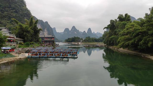 老寨山山脚下就是兴坪古镇和游客服务中心,游客服务中心一楼是游船出发和到达层,有游漓江的游船和到对岸的5元摆渡船。二楼是休息区和观景平台。