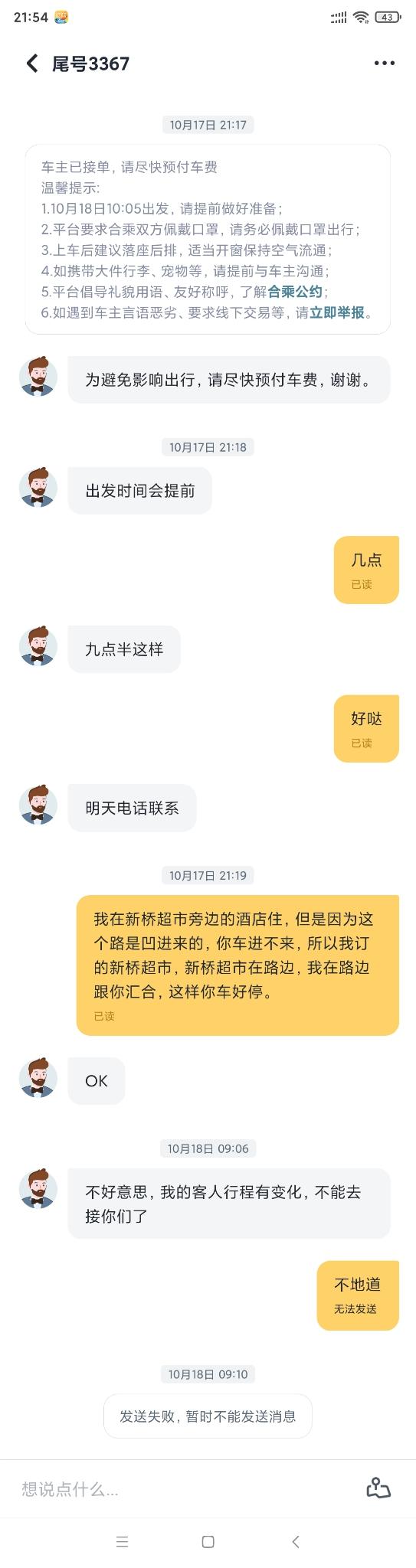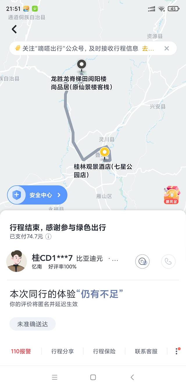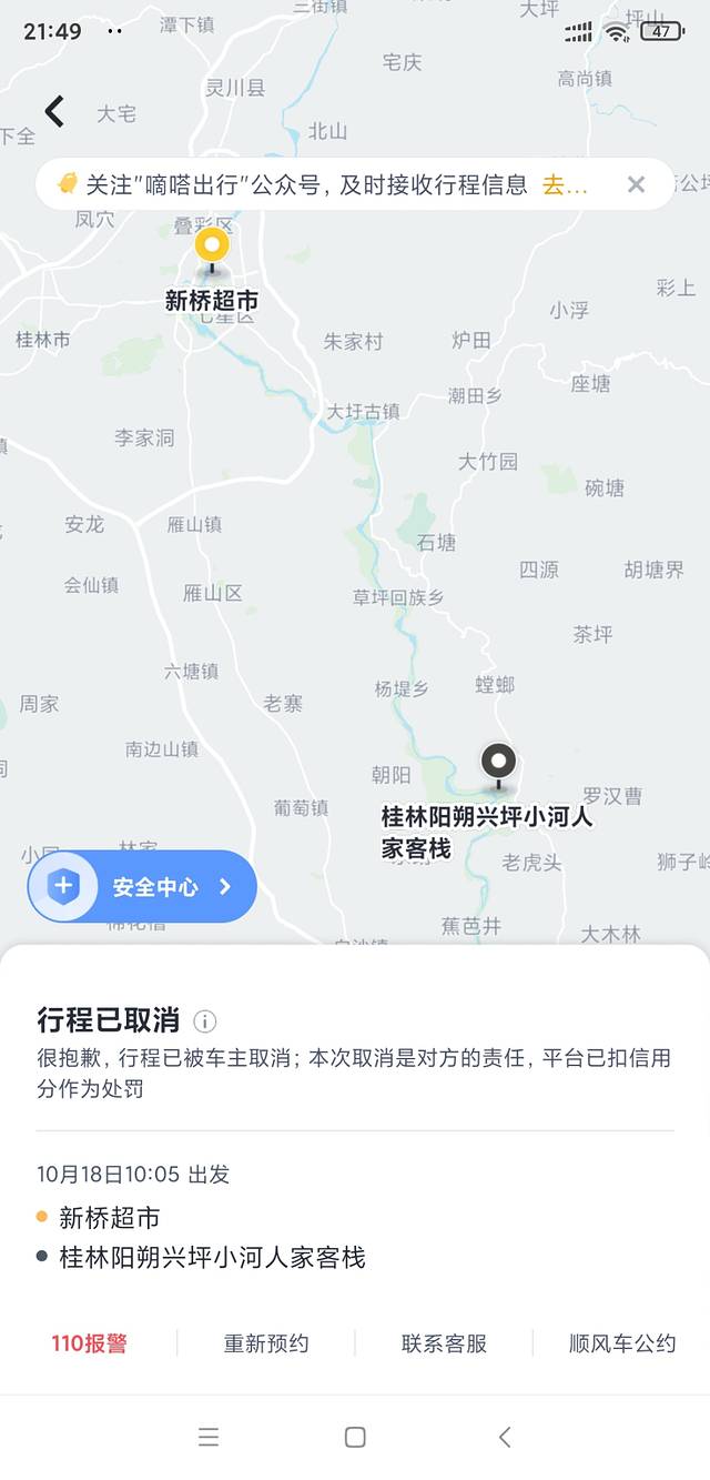 提前一天预约了9:30出发,桂林去兴坪民宿的嘀嗒顺风车,9:06却被司机取消,联系司机,司机说,因为原本他接的拼车单被乘客取消,所以他觉得单独接我这一单不划算,不去了。此时我已预付过车费,也收拾好行李等着了,他的突然取消让我措手不及。