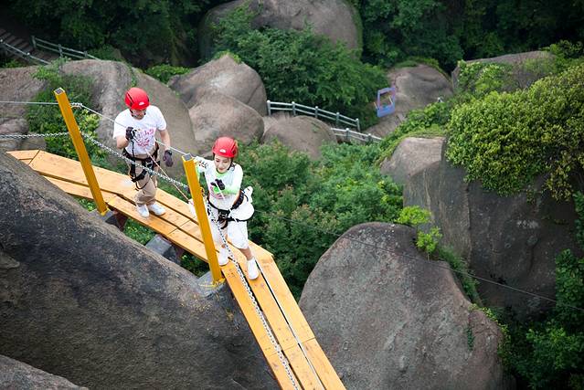 石林穿越70元悬崖跳桥30元,这是个2个项目在一起的,70元可以通玩。这个项目可以玩,比较安全,但很刺激,后背一个安全绳,你需要在空中走过三个云梯,每个云梯上的脚板的距离是越来越大的,脚板之间是空气,也就是说你要在空中一步一步的越过空气,踩着脚板过去,