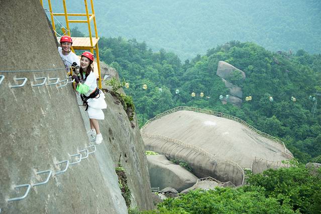 上山有两个选择,第一爬上去,走到顶1.4公里,走到玩项目的平台1公里。如果大家爬了一会,发现自己的脑子说:“我们要坚持”,腿说:“滚犊子”,放心,景区贴心的在你爬到600米处装了一个类似超市里面的电梯一样的电梯,比较长。交30块就可以直接到玩项目的平台的位置了(大玻璃那里),这个电梯两侧透明的,可以看一些景色。第二呢就是坐索道上去,直接坐到玩项目的位置,40大元。建议坐索道上山,或者爬了600米后就得了腿癌的患者可以坐电梯上山,这样到了玩项目的平台的时候才10点不到,天气还不是很热,一些项目可以玩的比较轻松。