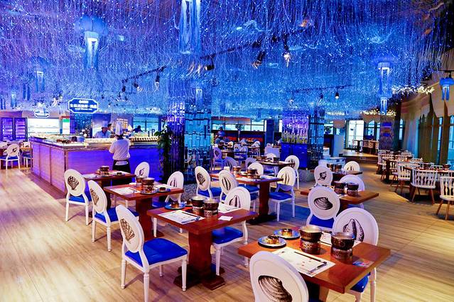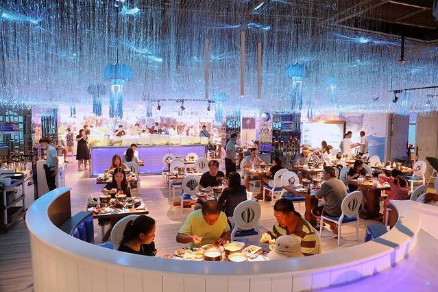 走进大悦洋餐厅,沉浸在绚丽晶莹的灯光之中,随着环境的色彩更迭变幻,整个环境优雅华美又充满动感。 餐厅海洋之蓝为主色调 , 配以水母、贝壳、海鱼等各种元素点缀其中, 一个海底童话世界仿佛呼之欲出,无人不为这一刻的浪漫所倾倒。
