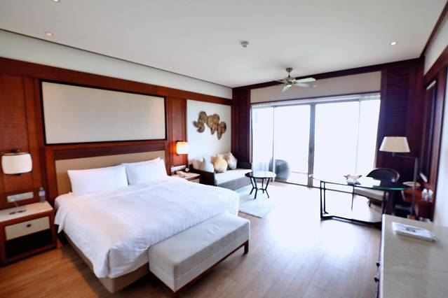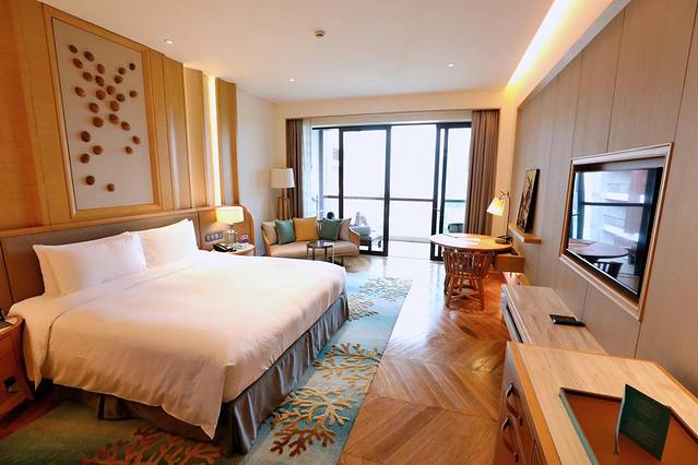 预订的客房是行政海景房,房间内饰采用原木自然基调色,配以热带海洋元素的地毯及淡雅的窗帘,整个房间看来特别的清新舒适。蓝色的地毯和地毯上的珊瑚图案算是房间中最亮眼的海洋元素,珊瑚绽放得充满张力,意寓茁壮成长。