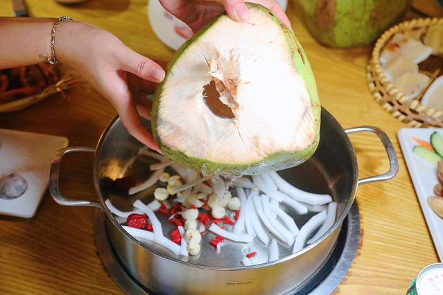 纯天然的椰子现点现开,再加入珍珠马蹄和新鲜椰肉一起熬制,汤汁鲜嫩清甜,等椰子水沸腾后再帮你倒入 海南 四大美味之一的 文昌 鸡。