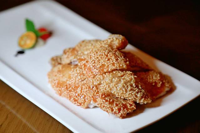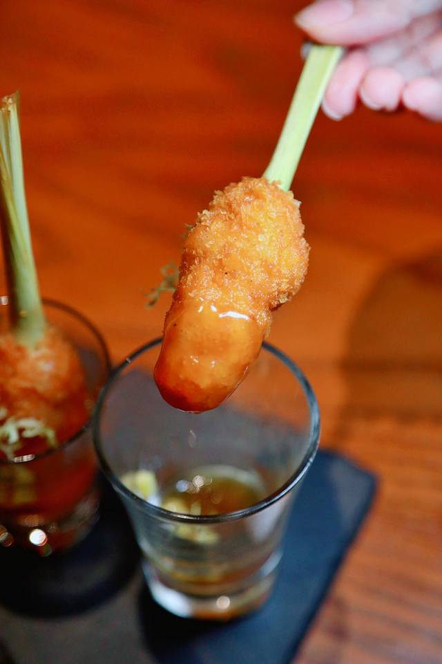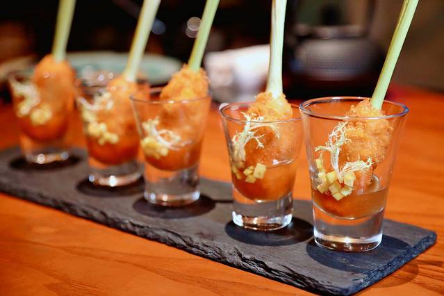 虾饼,鲜虾被打成虾胶,配上香茅和特调的汁酱,炸至色泽金黄,好吃又好看。 东南亚 独有的酸甜辣配合得恰到好处,做个开胃菜刚刚好。