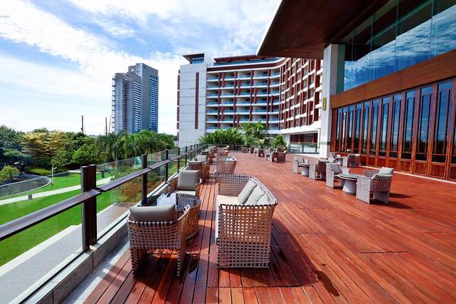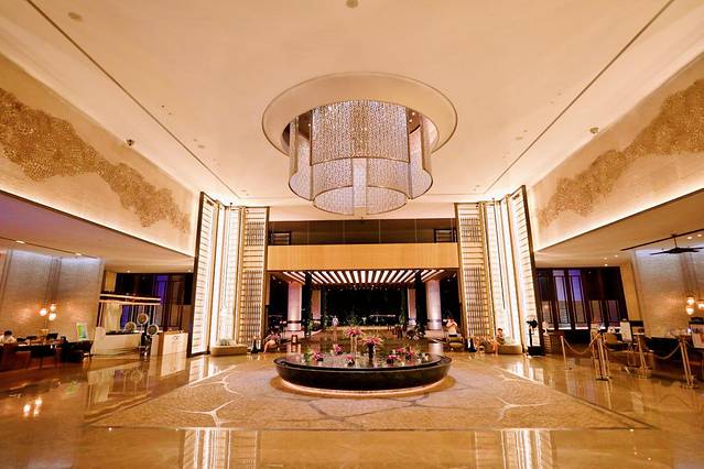 酒店的大堂很气派,暖黄色的灯光给人以温馨的感觉,极具特色的玻璃幕墙在光线的照射下,很是精致。在大堂外,有一个半露天的吧台,在这里坐着便能直接看到大海,没事的时候就可以在这里喝喝咖啡,看看书,或者品尝一下法式下午茶,拍拍照。