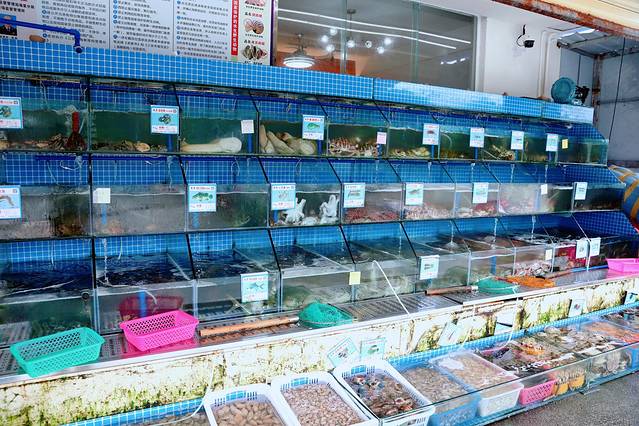 海鲜市场里有很多海鲜加工店的店员在揽客,让人眼花缭乱。打开了万能的点评软件找评价好的加工店,最后麻麻选择了口碑很不错的“林姐海鲜加工店”。