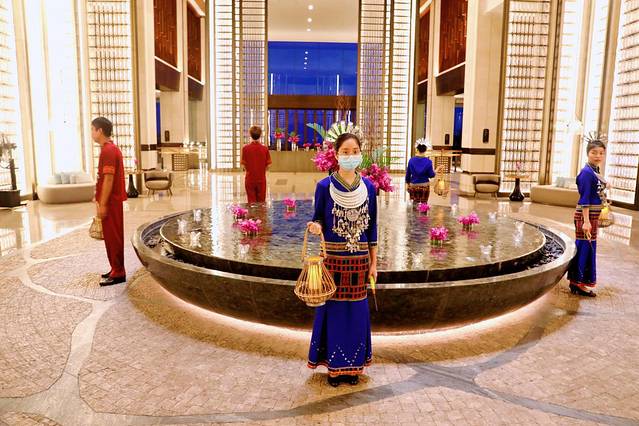 生活需要仪式感,生活的仪式不容忽视。身着黎族服饰的男女使者,会在大堂中央的莲花池旋转,并逐一点燃莲花 池上 的烛台。与此同时,酒店的驻店乐手也拉起了乐器,整个点烛仪式都是在这美妙动人的音乐声中进行的。