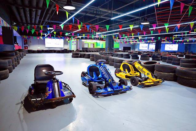 卡丁车的场地还是挺大的,有几个180度的大弯,可以漂移真的很刺激,不过小孩子要6岁以上的才能玩,在玩之前需要佩戴安全的装备。
