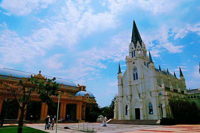 首先映入眼帘的便是这栋哥特式的教堂了。白色的外观,蓝色的花式玻璃窗户,以及那高耸着的深蓝色的屋顶,蓝天白天下,愈发的浪漫。